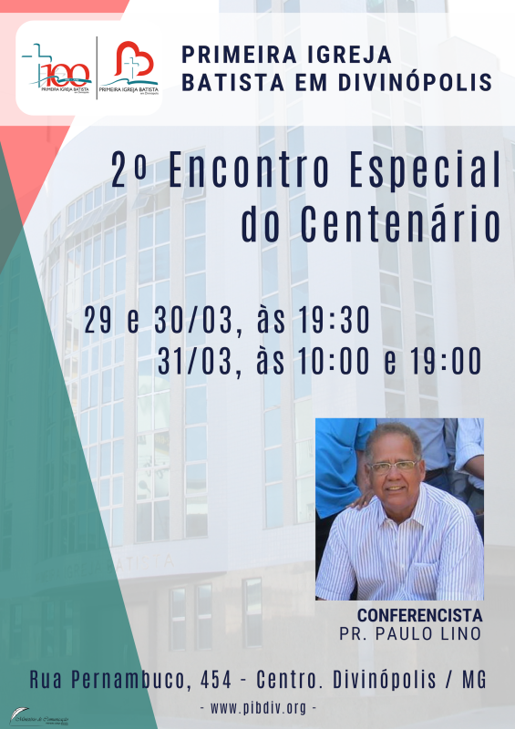 Continuando as comemorações do centenário batista em Divinópolis, receberemos o Pr. Paulo Lino no mês de março.