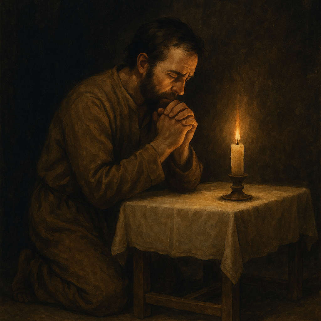 “Que Deus lá em cima os perdoe, e que não leve em consideração, os possíveis erros cometidos e sua falta de atenção.” De repente se levanta — o amor o põe de pé. O frio, a penumbra, não adianta. De joelhos ora com fé.